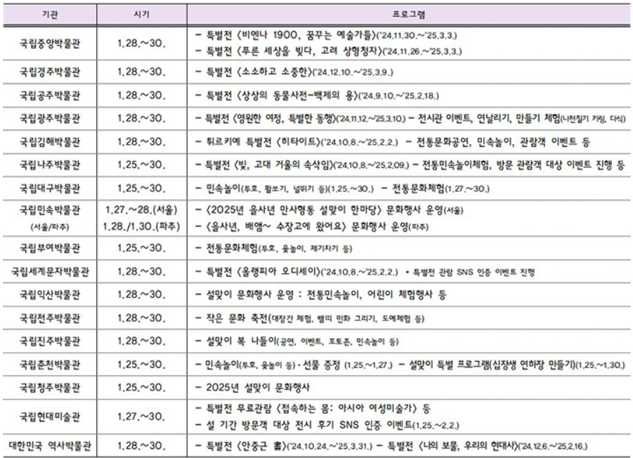 전국 국립박물관과 미술관에서도 설날을 기념한 무료 행사를 준비했습니다. 국립현대미술관에서는 특별전이 무료로 개방되며, 국립중앙박물관과 경주·광주·공주박물관 등지에서는 전통놀이 체험과 함께 설맞이 특별전이 열립니다.