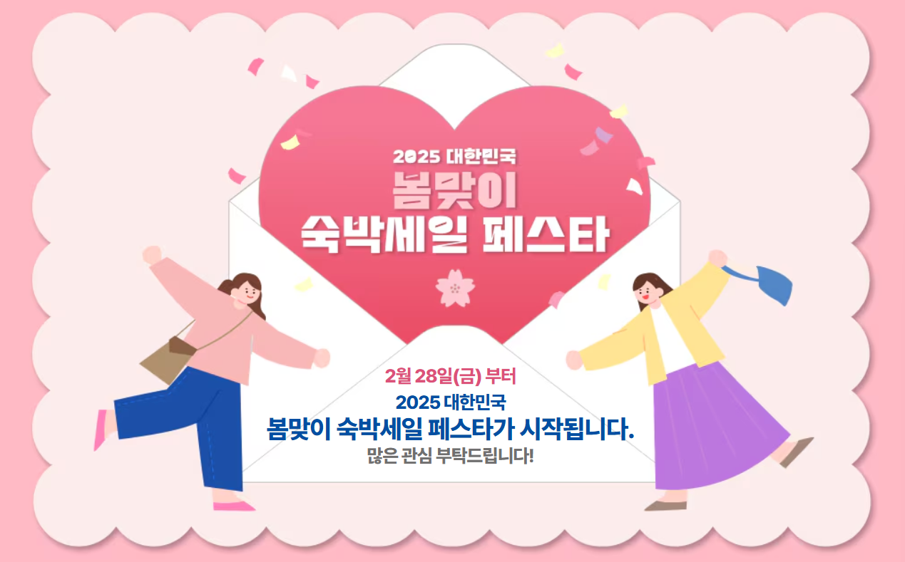 이번 **'2025 대한민국 봄맞이 숙박세일 페스타'**를 활용하면 부담 없이 봄 여행을 즐길 수 있는 절호의 기회입니다. 할인받아 합리적인 가격으로 숙소를 예약하고, 따뜻한 봄날의 정취를 만끽하며 특별한 추억을 만들어보세요. 이번 기회를 놓치지 말고 여행 계획을 세워보시길 추천합니다! 😊