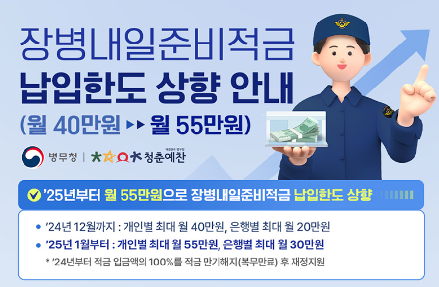 2024년 12월 31일 이전에 가입한 장병들도 기존 가입 은행에서 적금 납입한도 상향을 신청하면 2024년 기준이 적용됩니다.